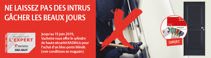 Jusqu’au 15 juin 2019, DMS MAINTENANCE votre serrurier agréé l'Expert Vachette à Schnersheim vous offre le cylindre de haute sécurité RADIALis pour l’achat d’un bloc-porte blindé Vachette.